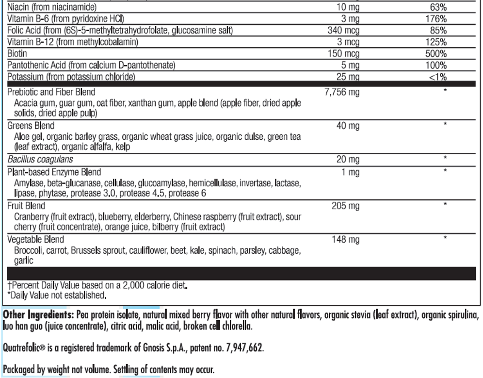 Great tasting, nutrient-rich superfood powder combining phytonutrients, digestive enzymes, shelf-stable probiotics, fiber and plant-based protein*