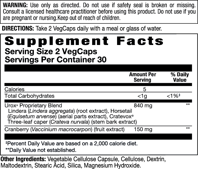 - Urox proprietary blend features lindera root extract, horsetail, Cratevox,® and three-leaf caper stem bark extract