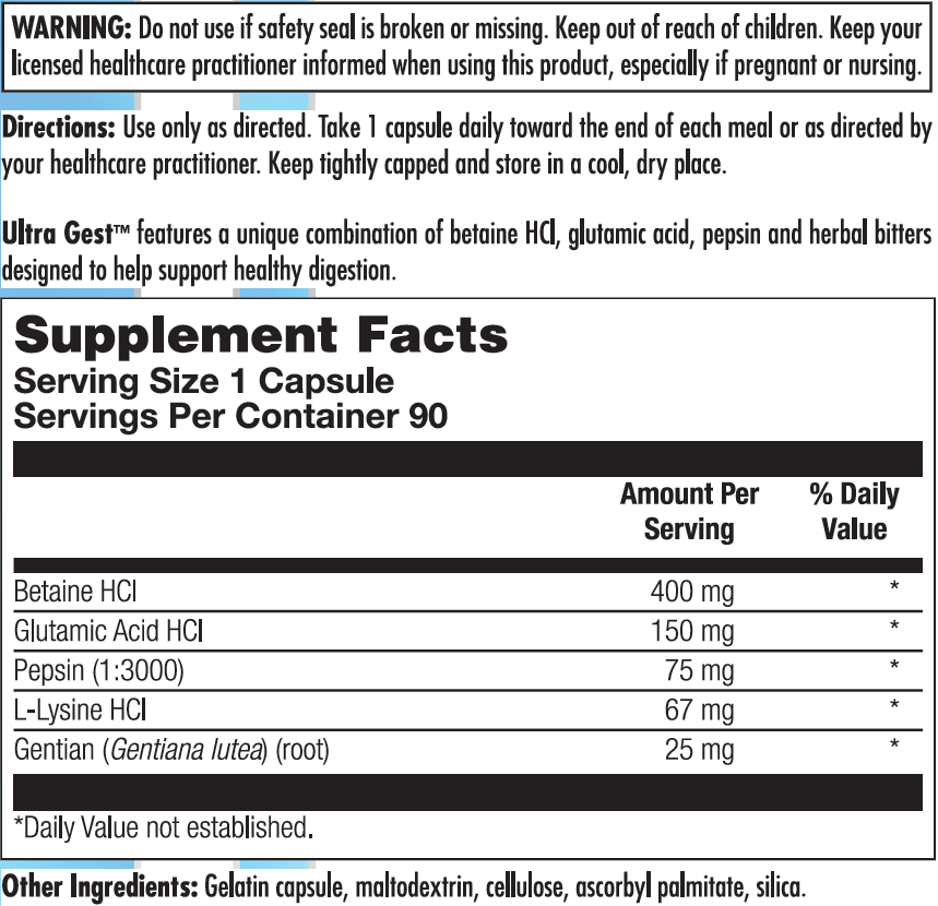 Unique combination of betaine HCl, glutamic acid, pepsin, and herbal bitters designed to help support healthy digestion*